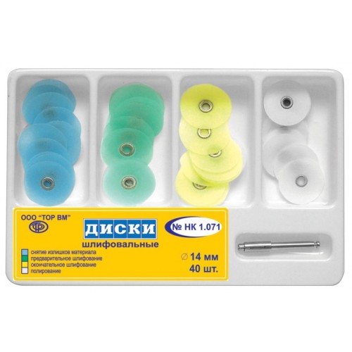 Универсальный комплект шлифовальных дисков 1.071 предназначается для полной обработки реставраций из композитных материалов. В него входят диски для снятия излишка материала, предварительной и окончательной шлифовки и полировки.